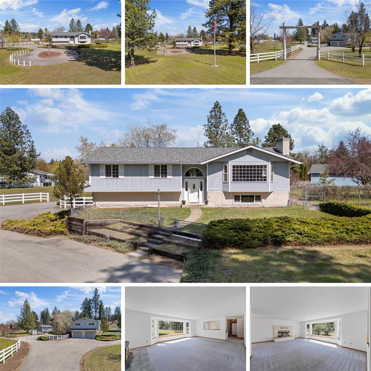 Mead Schools close in 4.1 acres with Mt. Spokane views on Peone Prairie! 1995 turnkey Split Entry with 4 bedrooms, 3 baths and all freshly painted inside, huge main floor family room with fireplace and lots of windows for natural light. Great kitchen with island and all appliances and breakfast nook. New vinyl slider takes you out to a nice covered deck. Daylight walkout basement with another family room, bedroom and bath and laundry room. Two car attached garage plus a 40x60 shop. Newer roof, sprinklered parklike grounds, gas forced air heat and central A/C.