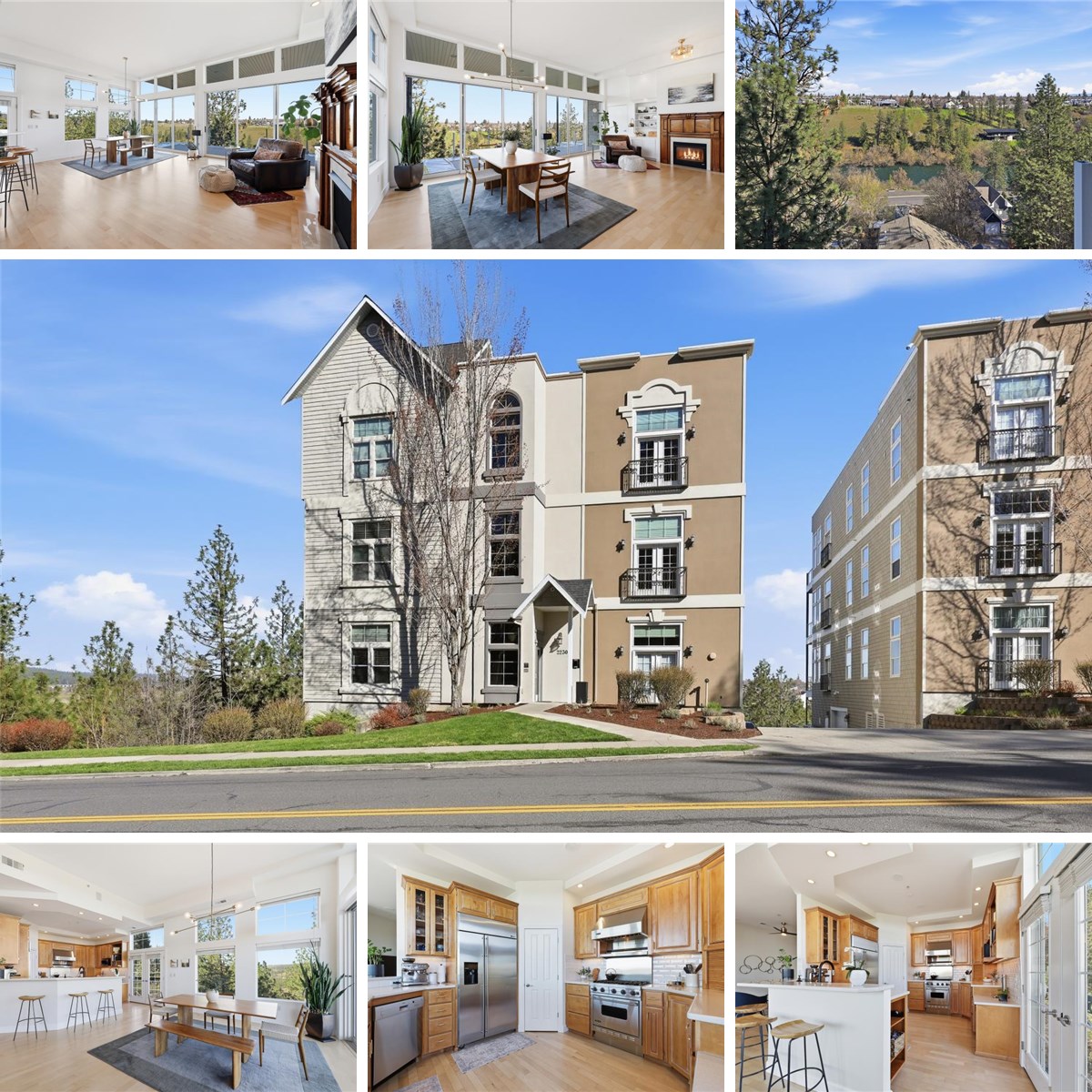Exquisitely designed custom condominium offering commanding panoramic views over Peaceful Valley, the Spokane River, Kendall Yards and Downtown Spokane. This stunning residence is bathed in natural light and showcases a sophisticated open-concept design with soaring 10'-12' ceilings and rich maple flooring throughout. An extraordinary living space is anchored by a dramatic 24' wall of sliding glass, seamlessly extending to an expansive covered deck, an exceptional setting for outdoor living and unforgettable sunset vistas. The kitchen includes premium stainless-steel appliances, Corian counter tops, walk in pantry, desk area, and eating bar while the dining area is spacious with a Juliet balcony. The oversized primary suite offers a serene retreat with walk in closet, ample storage, double sinks, window seat, walk in shower and washer/ dryer. A rare opportunity to experience luxury living with unparalleled views and timeless design.