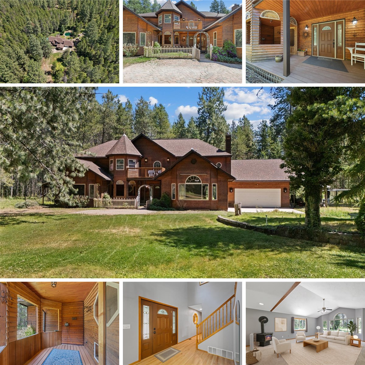 Storybook-style 1.5 story custom cedar home nestled on 4.7 secluded, wooded acres! Relax on the charming front porch with sitting area, or explore the peaceful grounds featuring a pond with water feature, multiple decks, patio, 6-person spa, large enclosed garden, and apple & pear trees. Thoughtfully updated with refinished hardwood floors, new flooring, fresh interior paint, new roof ('19), furnace ('21), central A/C ('23), & all appliances included. The spacious country kitchen showcases solid wood cabinetry, granite counters, custom island with seating, stainless steel appliances, gas range ('21), & pantry. Main floor primary suite features two walk-in closets, garden tub, travertine tile shower and floors, & double sinks. The main level also offers an office, living room with wood stove, dining area, laundry room, & a half bath. Upstairs provides a large loft, family room with deck access, updated 3/4 bath, two bedrooms, & a third bedroom/bonus room with attic storage. Total privacy with room to roam!