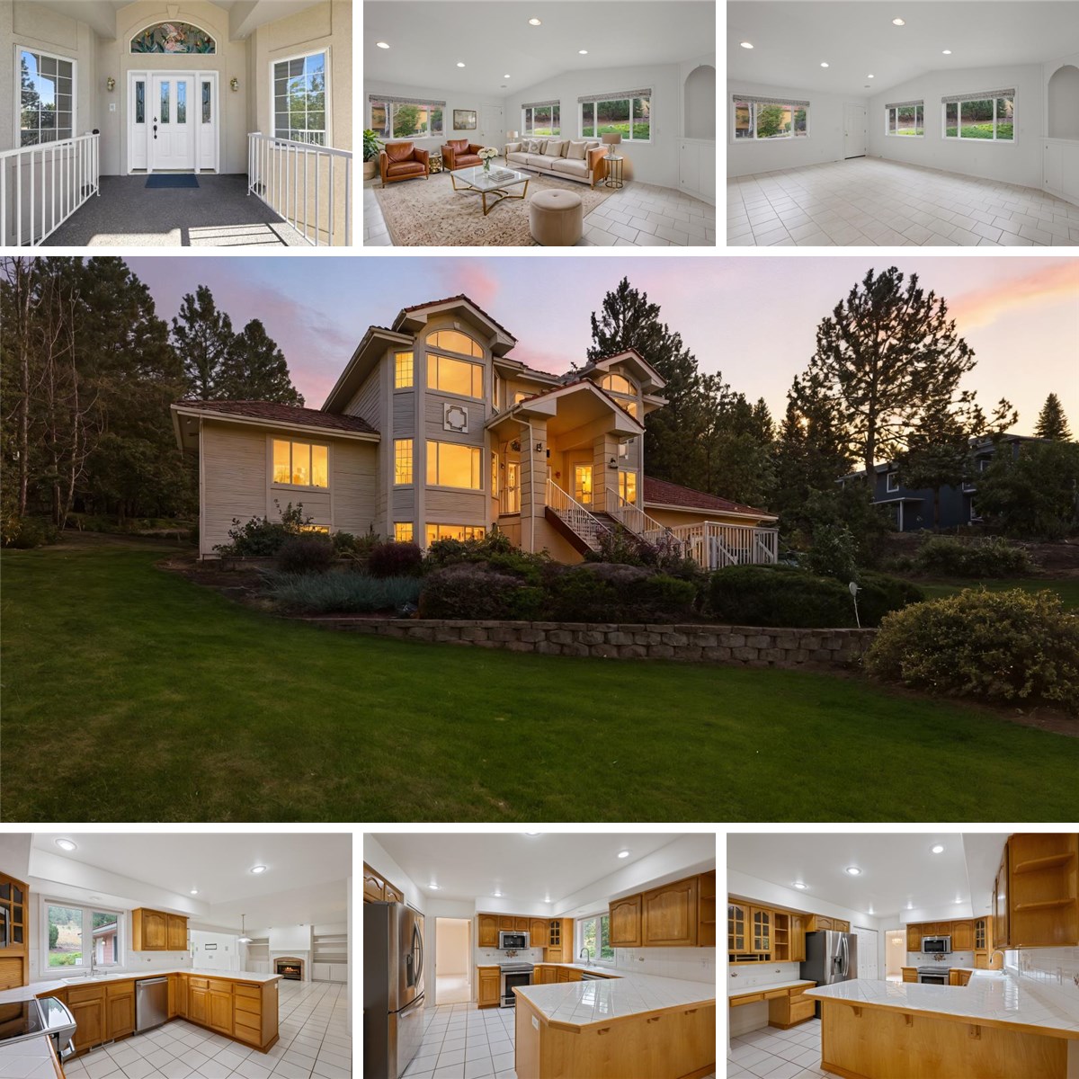 Extraordinary opportunity to own a 5-bedroom, 4 bath home perched on nearly one acre with stunning Westerly views. Updated with new paint inside & out, new carpet & windows. Located on Spokane's South Hill just minutes to downtown yet close to country living and surrounded by million-dollar homes. The main floor has large rooms with a formal dining and office. Upstairs has the primary suite plus two bedrooms and a bath. The lower level has its own entrance, great for multi-generational living with two bedrooms, bath and its own mini kitchenette and living room. Custom-built and well maintained by the original owner, this is a special home with curb appeal, lots of space and wonderful views!